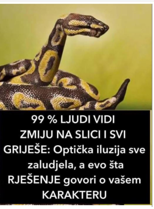 Ako ste među onih 99% koji su najprije vidjeli zmiju, to može značiti da ste osoba izraženih liderskih osobina. Vi ste tip koji često donosi odluke nagonski, ne zadržavajući se previše na detaljnoj analizi. Ljudi vas doživljavaju kao harizmatičnog i duhovitog pojedinca, što vas čini izuzetno privlačnim u društvu. Međutim, iako ste skloni preuzimanju rizika, često pokazujete određenu emocionalnu distanciranost kad je riječ o empatiji prema drugima.