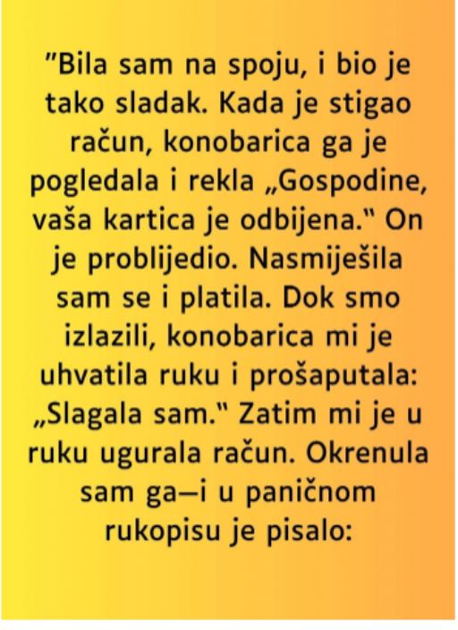 Naš je dijalog prožimao brojne teme, prožet smijehom, podsjećajući na scenu iz romantične komedije. No, atmosfera se promijenila kada je račun predstavljen. Konobarica je prišla, kratko pogledala račun, a onda rezigniranom kretnjom prenijela nesretnu informaciju: “Gospodine, vaša kartica je odbijena.” Ten mu je brzo izblijedio, a osmijeh je nestao kao da je izbrisan. Bilo je očito da ga obuzima mješavina tjeskobe i zbunjenosti. Dok je zurio u mene, osjetila sam promjenu u atmosferi, signalizirajući da nešto nije u redu. S obzirom da nisam imao problema s karticom, samo sam se nasmiješio i pristao platiti račun. Završio sam transakciju i unatoč osjećaju unutarnje nelagode, odlučio sam to ne otkriti. Prije nego što smo izašli iz restorana, konobarica me neočekivano uhvatila za ruku.