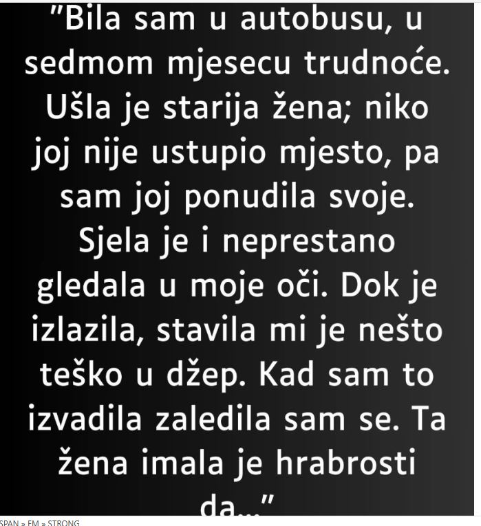 Kada se starija žena približila izlazu iz autobusa, iznenada je nešto stavila u džep mlade trudnice. U prvi mah, trudnica nije znala šta se dešava, ali kada je zavukla ruku u džep, bila je zaprepašćena – u njemu se nalazio veliki, težak kamen. Ovaj neočekivani gest ju je potpuno zbunio.