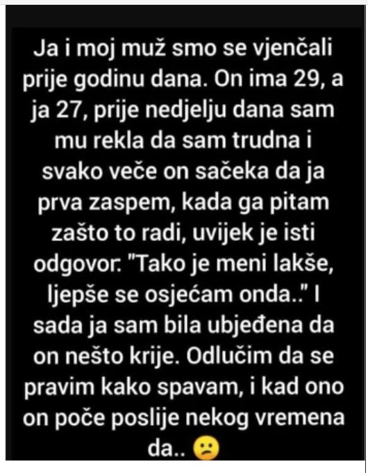 U tim danima radosti, stigla je još jedna radosna vijest – saznala je da je trudna. Ali ono što je uslijedilo bilo je neobično. Njen muž je svake večeri čekao da ona zaspi prije nego što bi legao pored nje. Kada ga je pitala zašto to radi, odgovorio je jednostavno: “Tada mi je lakše… osjećam se opuštenije.”