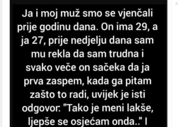 Nakon što smo proslavili godišnjicu braka, moj suprug (29) i ja (27) primili smo radosnu vijest o mojoj trudnoći. Međutim, neobično ponašanje mog supruga počelo je da mi privlači pažnju. Svake bi večeri strpljivo čekao da zaspim prije nego što bi mi se pridružio u krevetu. Kada sam ga pitala zašto, odgovarao bi pomalo neuvjerljivo: “Jednostavno mi je lakše, tada se osjećam opuštenije…”