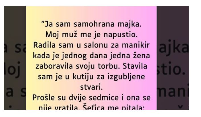 Jednog dana, dok je radila u salonu, dogodio se trenutak koji će joj zauvijek ostati u sjećanju. Na stolu je ostavljena torba koju je neka žena zaboravila. Iako je torba bila zanemarena, ona ju je stavila u kutiju za izgubljeno i nađeno, očekujući da će se vlasnica vratiti. No, prošlo je mnogo dana i žena se nije vratila po torbu. I tada ju je njezin nadređeni upitao: “Želite li tu torbu?” Iako je bila zbunjena, iz znatiželje je pristala otvoriti torbu.