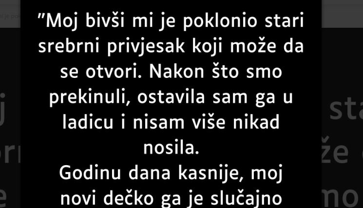 Jedan naizgled običan srebrni privjesak, poklon od bivšeg partnera, skrivao je iznenađujuću priču. Nakon raskida, vlasnica ga je odložila u ladicu i zaboravila na njega. Privjesak je ponovo izašao na svetlo dana godinu dana kasnije, kada ga je slučajno pronašao njen novi dečko.
