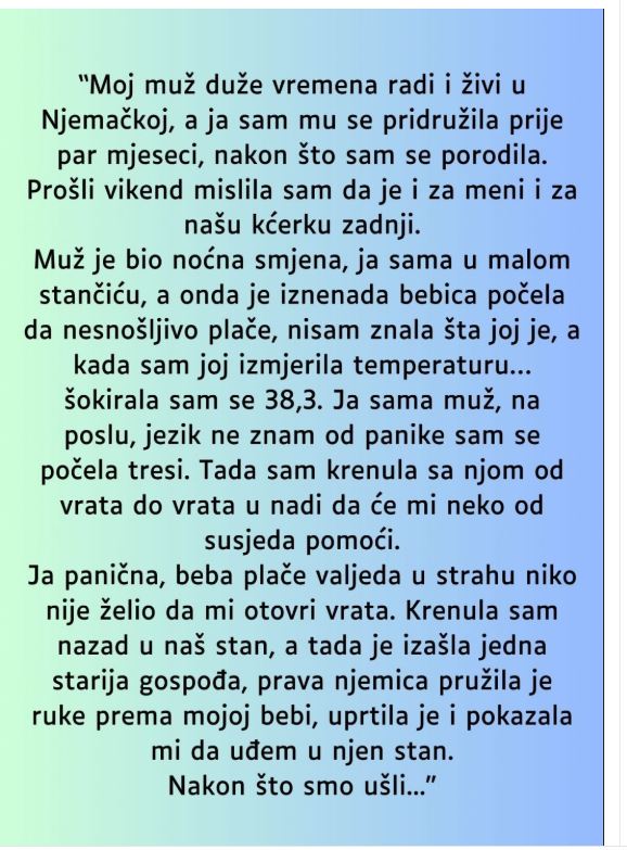 - Vaša priča o trenutku kada ste se našli u panicama zbog bolesti vaše bebe, dok je vaš suprug bio na noćnoj smjeni, pokazuje koliko je život u inozemstvu sa svim izazovima, poput jezika i kulture, može biti stresan. No, ono što se dogodilo nakon toga, kada je susjeda pokazala izuzetnu ljubaznost i pomogla vam u trenutku krizne situacije, može se smatrati pravim primjerom zajedništva i humanosti. Iako je korištenje alkohola za smanjenje temperature vaše bebe bilo potpuno nespojivo s vašim osobnim uvjerenjima, važno je istaknuti da je ta pomoć pomogla smiriti situaciju i omogućila da vaša beba sigurno zaspi.