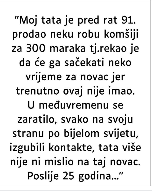 Pre nego što je rat izbio 1991. godine, jedan čovek je prodao robu svom susedu za 300 maraka. Pokazavši razumevanje, istakao je da može sačekatiplaćanje, jer je sused u tom trenutku bio u teškoj finansijskoj situaciji.