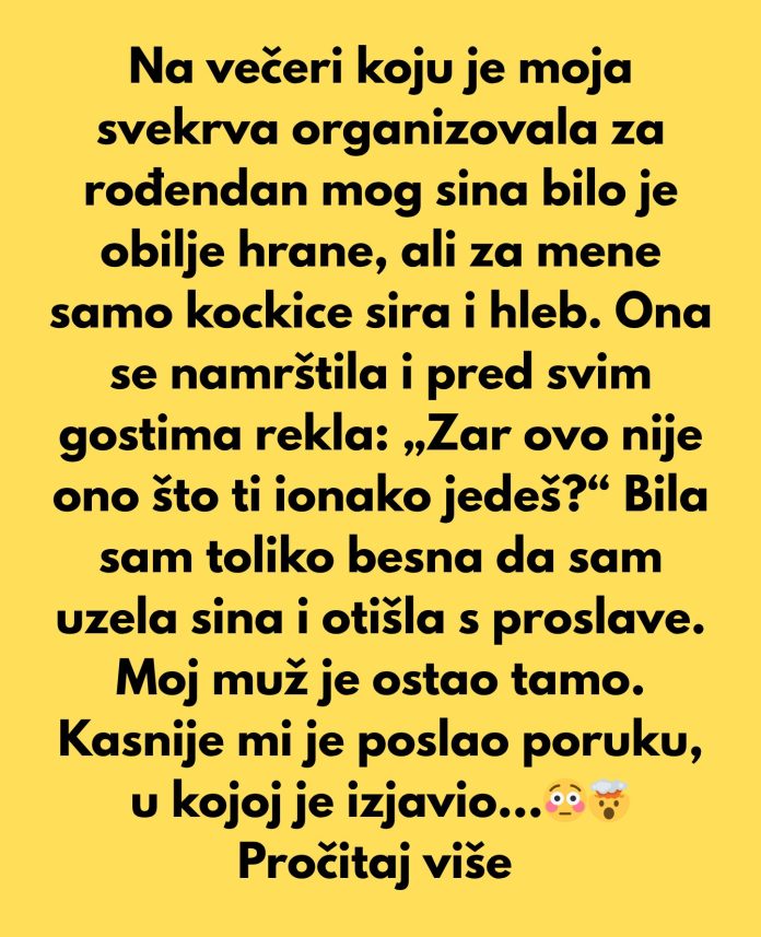 Međutim, ono što je usledilo dodatno je zakomplikovalo odnose. Suprug je ostao na proslavi i poslao poruku: „Ne očekuj da večeras dođem kući. Ponizila si moju majku i uništila našem sinu rođendan.“ Umesto da razume osećanja svoje žene, on se stavio na stranu majke, zanemarivši činjenicu da je upravo njegova žena bila ta koja je bila ponižena.