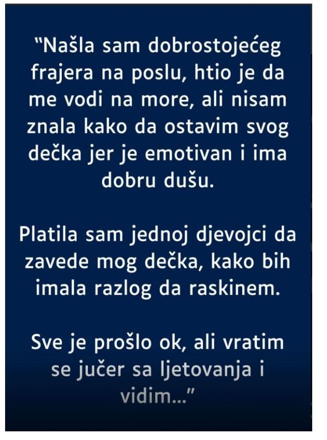 Usput, tokom jednog neobičnog razdoblja mog života, imala sam susret s osobom koja je finansijski stabilna i predložila mi odlazak na plažu. Međutim, bila sam suočena s dilemom: kako to saopštiti svom pažljivom, ali i vrlo osjetljivom dečku. U meni se rodila ideja – nova poznanica bi mogla steći njegovu simpatiju, omogućujući mi tako laganiji izlazak iz naše veze i početak novog životnog poglavlja.