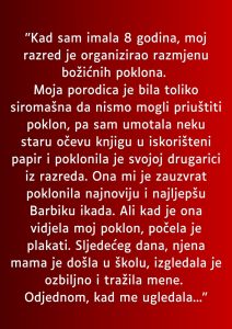 - Sutradan se dogodilo nešto neočekivano. U razred je došla majka djevojčice koja je plakala. U rukama je nosila kesu s poklonima – igračkama, slatkišima, sitnicama. Ali ono najvažnije nisu bile stvari. Bio je to način na koji je govorila.