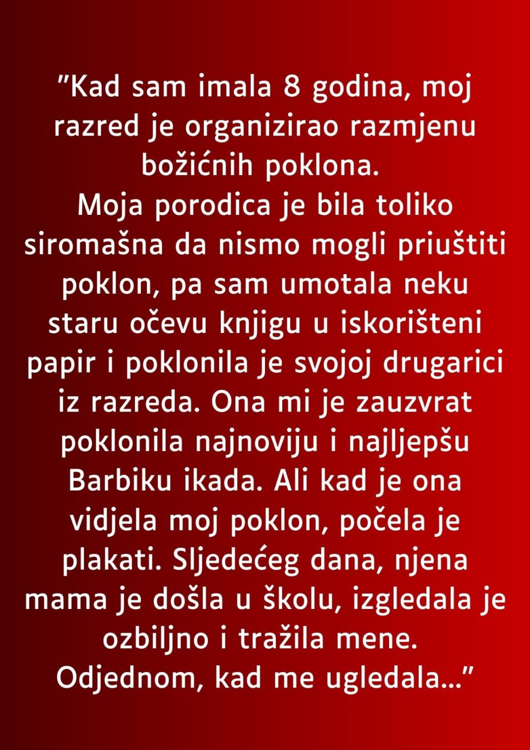 Bilo je to u osnovnoj školi, u vrijeme kada su školske učionice bile cijeli svijet. Tog decembra učiteljica je najavila razmjenu poklona. Djeca su odmah počela da uzbuđeno pričaju o igračkama, slatkišima, kutijama sa mašnama i šarenim papirima.