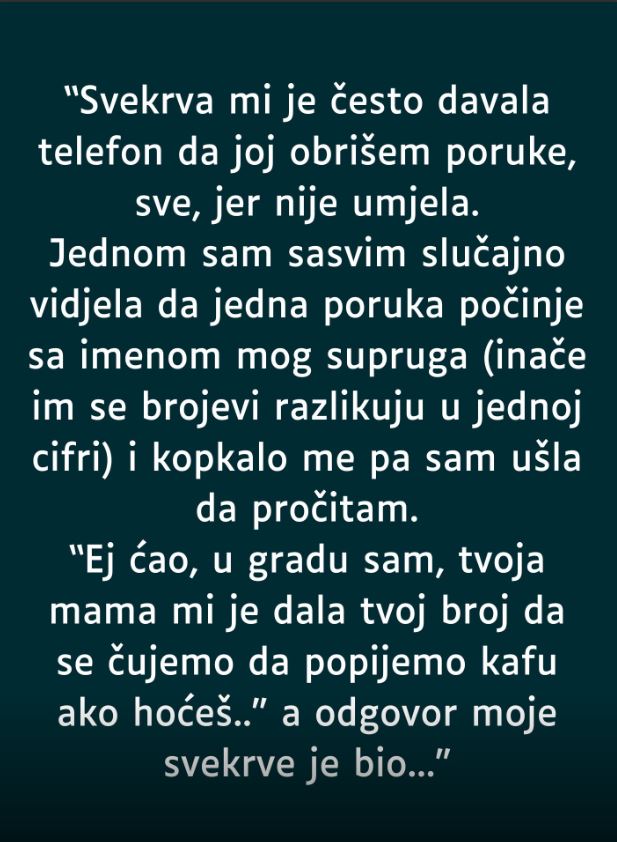 Svekrva je često tražila pomoć od snaje da joj obriše poruke i druge sadržaje sa telefona, jer nije bila vešta sa tehnologijom. Jednog dana, dok je obavljala taj zadatak, primetila je poruku koja je privukla njenu pažnju. Poruka je bila upućena na broj koji je imao gotovo identičan niz cifara kao suprugov, razlikujući se samo u jednoj znamenki.
