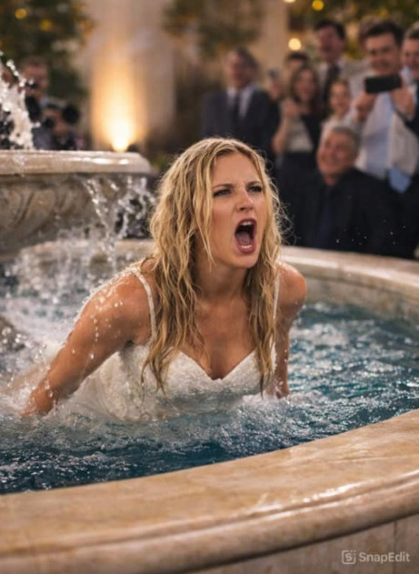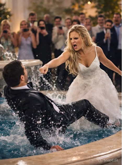 Iznenada, mladoženja je, gotovo u trenutku, gurnuo nevjestu prema vodi. Nevesta, iznenađena i nesposobna da reaguje, pala je u fontanu. Dok su svi gosti zapanjeno posmatrali situaciju, haljina joj je odmah postala teška od vode, kosa se neuredno raširila, a šminka je počela razlijevati niz lice. Paničan trenutak zamijenio je onaj romantični, a atmosfera se naglo napela. Gosti su se počeli smijati, ali situacija je bila sve samo ne smiješna za nevjestu, koja se borila da izroni iz vode.