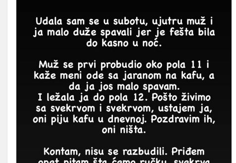 - U želji da se pridruži ostatku porodice, domaćica se zaputila u dnevni boravak, gde su već sedele svekrva i baka. Iako ih je srdačno pozdravila, naišla je na hladnu tišinu. Njihova reakcija bila je gotovo kao da je ne primećuju – ostale su zamišljene i ćutljive, što je stvorilo osećaj nelagodnosti. Pokušaj da se opusti uz jutarnju kafu bio je neuspešan jer nije bilo ni topline ni dijaloga.
