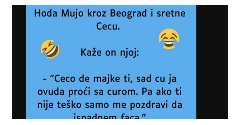 Mujo je jednog dana putovao Beogradom i, kao što to obično biva, sreo svoju staru prijateljicu Seku. Sa osmijehom se obratio: “Ceco de Mama, sada moram provesti ovo vrijeme s tom djevojkom.” Na prvi pogled, možda je ovo zvučalo pomalo zbunjujuće, ali Seka nije oklijevala i odgovorila: “Dobro, to nije problem.” Čini se da Mujo i Seka imaju jedan od onih prijateljskih odnosa gdje razumijevanje i podrška nisu nikada upitni.